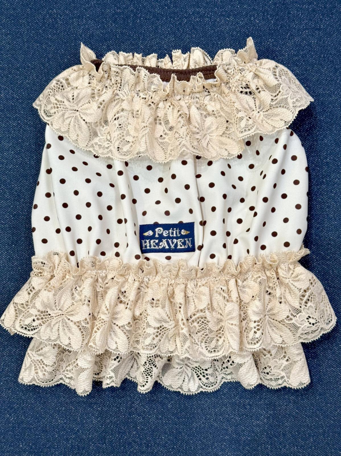 優しいアイボリーをベースにブラウンのドット柄が可愛いガーリービスチェ💕